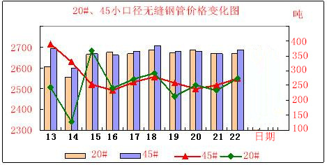 今日聊城無(wú)縫鋼管小口徑價(jià)格行情,20#、45#材質(zhì),10月13-22號(hào)價(jià)格變化走勢(shì)圖,更直觀的讓采購(gòu)客戶了解現(xiàn)貨價(jià)格及庫(kù)存走勢(shì),實(shí)時(shí)顯示最前沿價(jià)格調(diào)整預(yù)測(cè),為您提供最及時(shí)有效的價(jià)格參考建議。